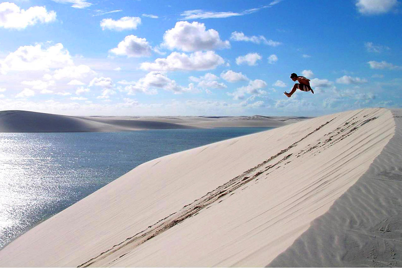 Vale lembrar que, nessa época, muitas lagoas estão secas por conta da evaporação devido ao sol intenso, vento e ao soterramento da lagoa pela areia da duna, transformando tudo em um deserto sem fim.